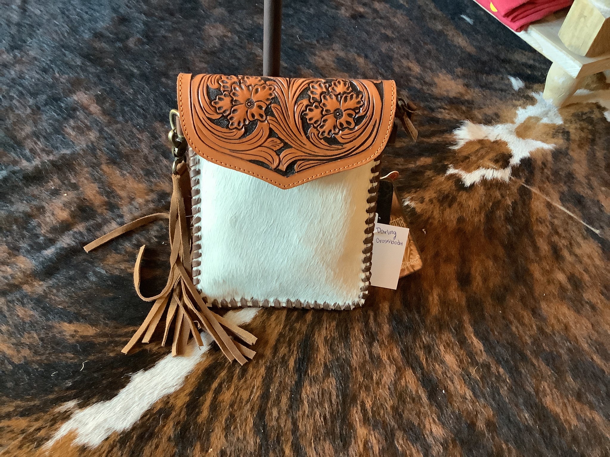 Tooled cowhide and leather bag with a detailed leather clasp