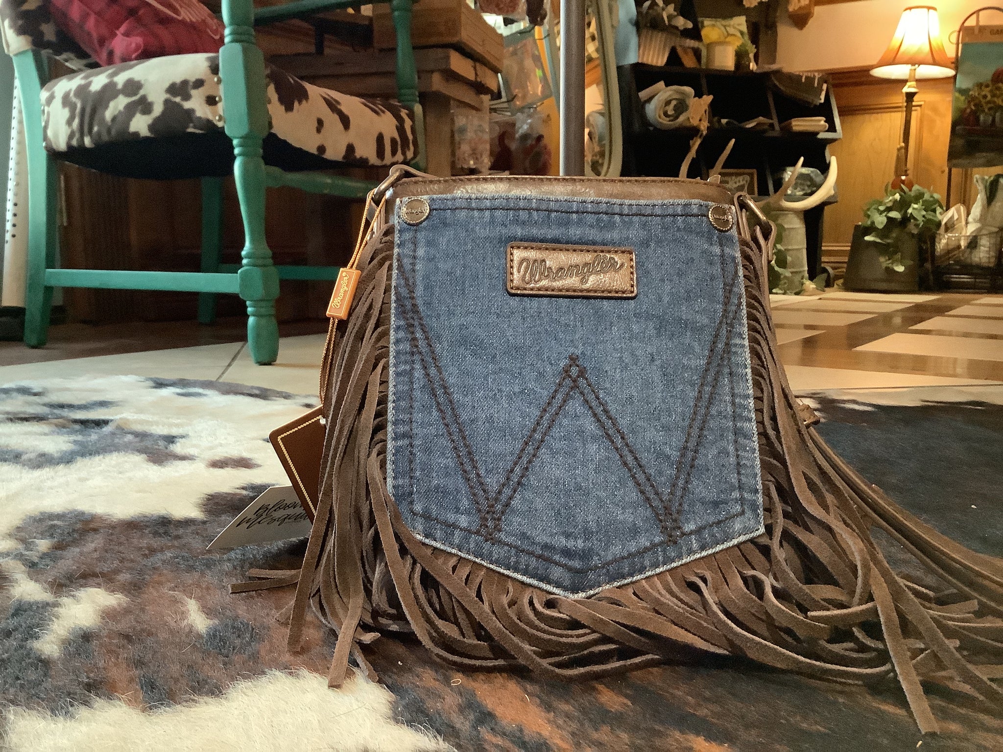 Denim Wrangler pocket with a leather backside and brown fringe surrounding the whole bag