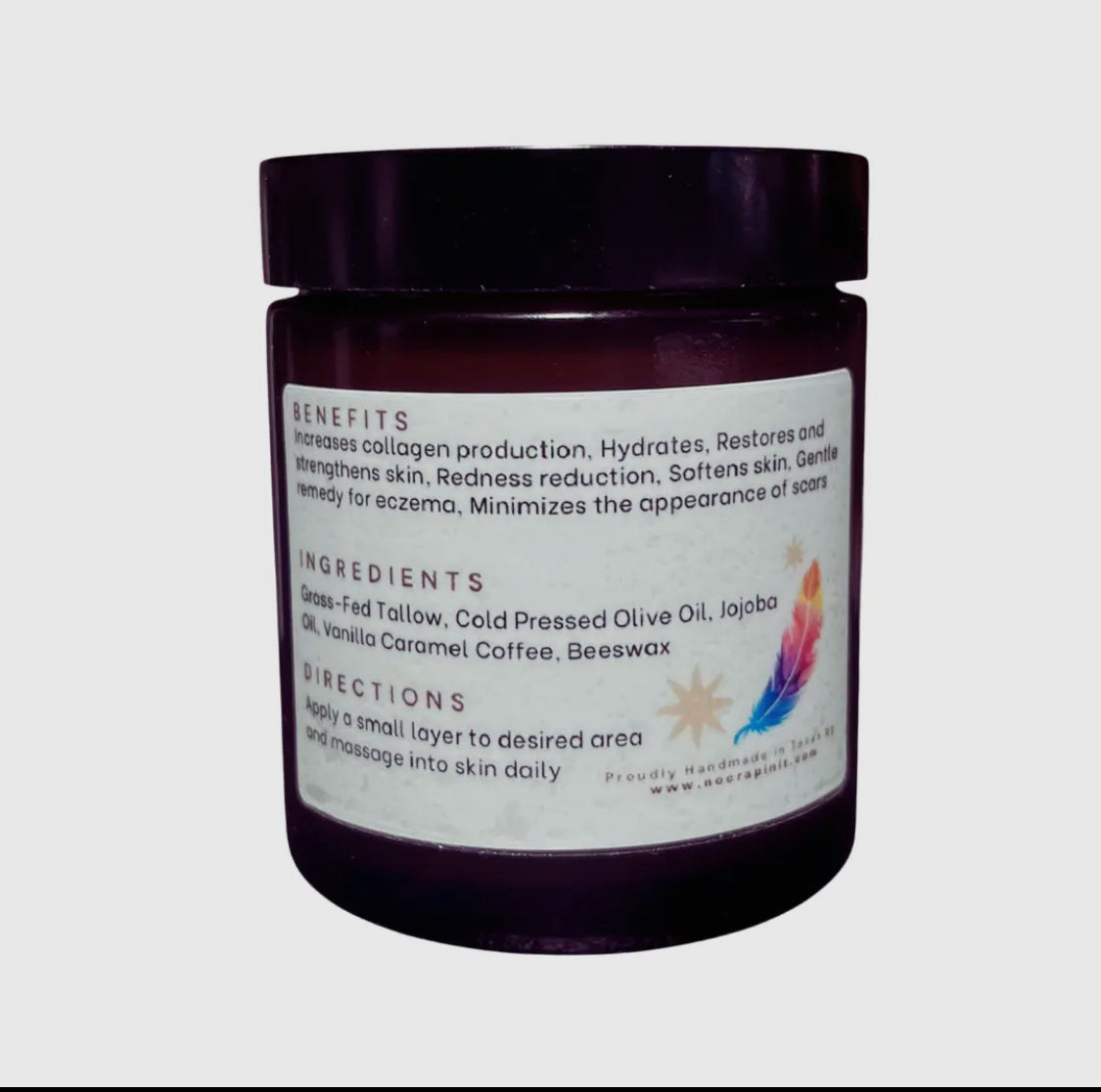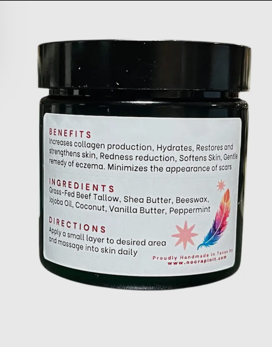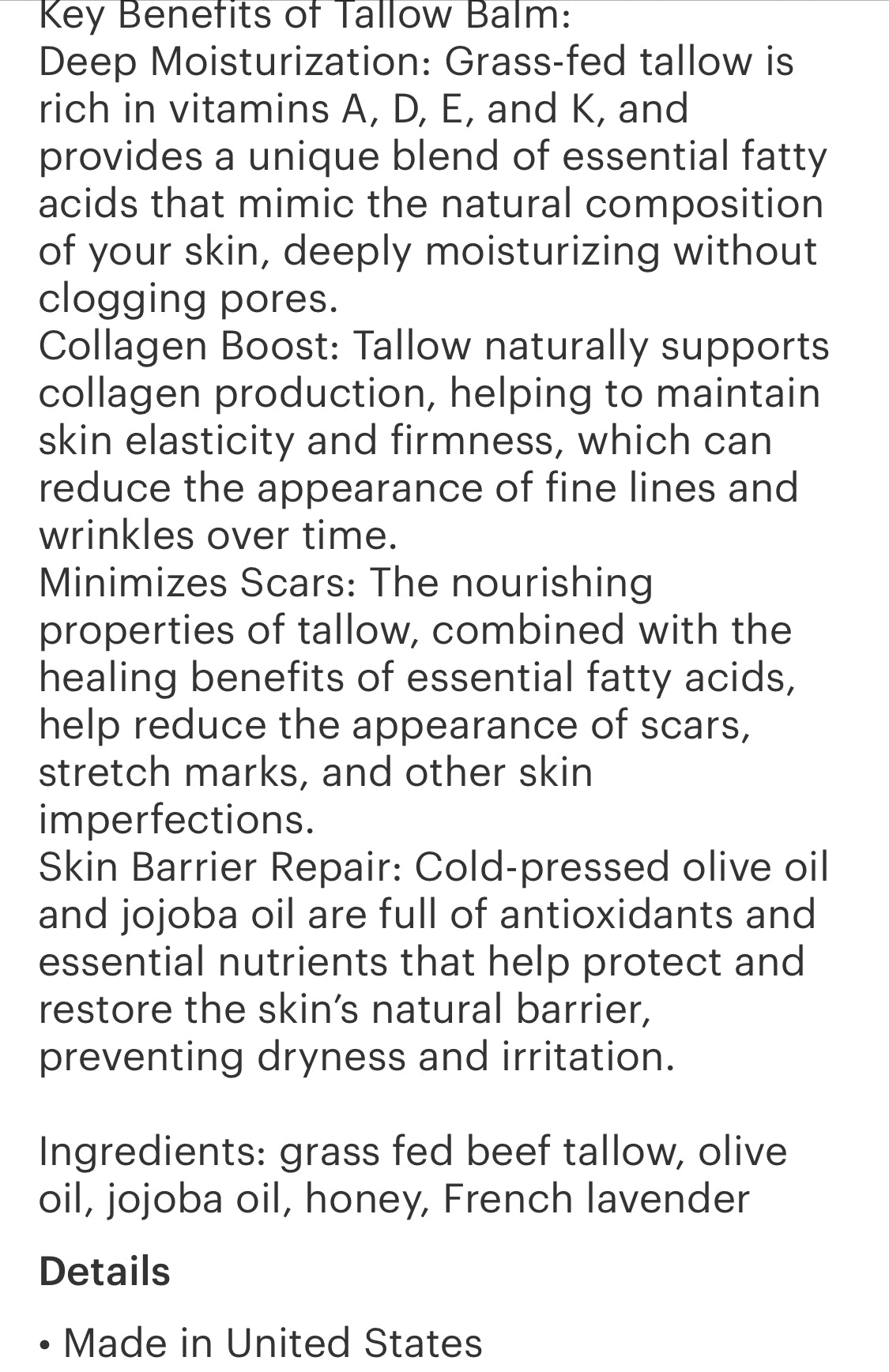- Deep Moisturization: Grass-fed tallow is rich in vitamins A, D, E, and K, and provides a unique blend of essential fatty acids that mimic the natural composition of your skin, deeply moisturizing without clogging pores.
