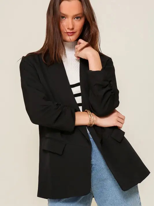 Satin lined blazers. Such a classic look! You can do a professional, dressed up, or just a casual look. The black is straight sleeves, nice front pockets.The mocha has ruched sleeves and side slit pockets.